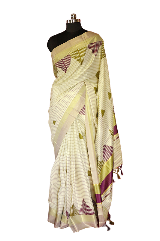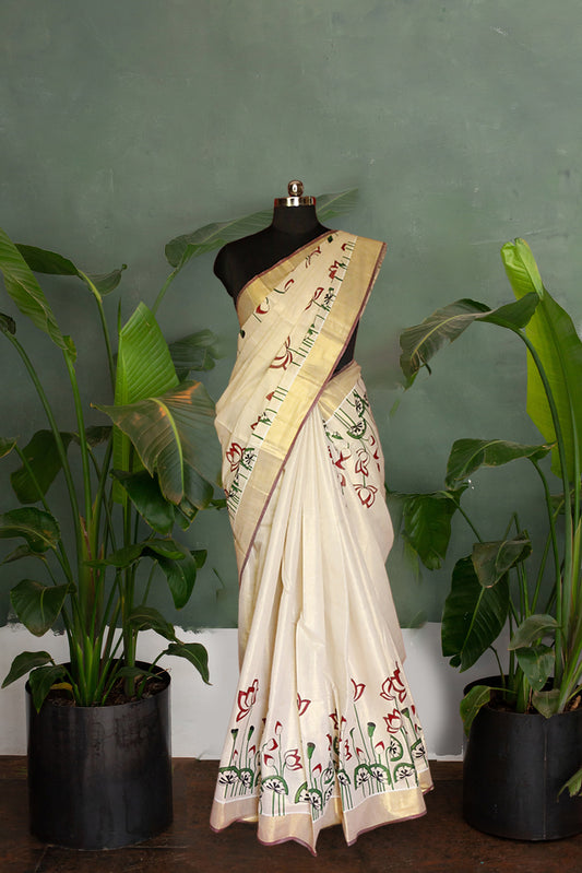 Step into the rich legacy of Kerala with our Traditional Sarees, which showcase intricate craftsmanship and cultural authenticity. Handloomed with precision, these sarees feature unique motifs inspired by nature, mythology, and temple art. The iconic kasavu detailing is meticulously crafted, making each saree a piece of art. Kerala Traditional Sarees are a staple for weddings, rituals, and other grand celebrations, reflecting the cultural pride of God’s Own Country. Pair them with traditional blouses and antique jewelry for an unforgettable look steeped in heritage.