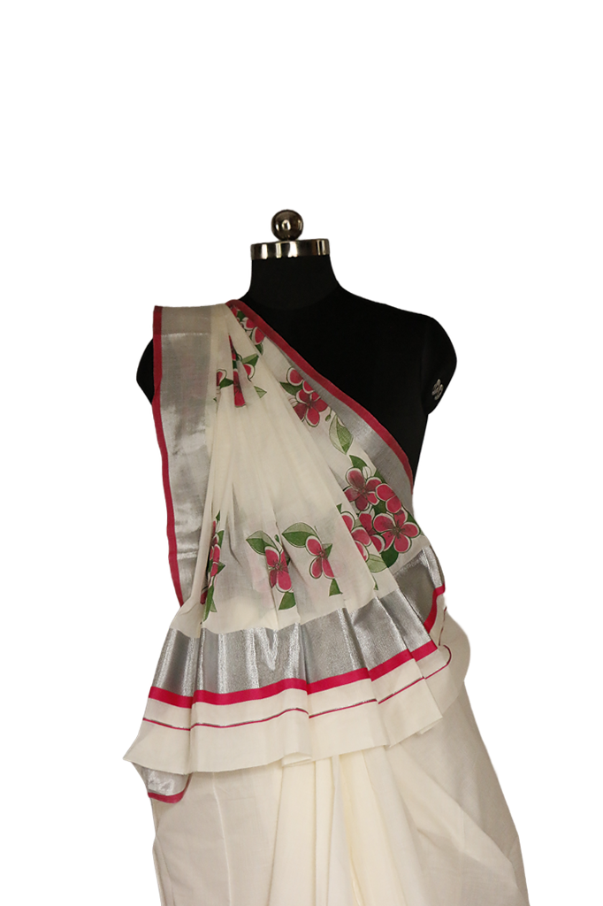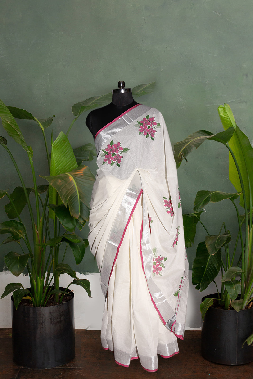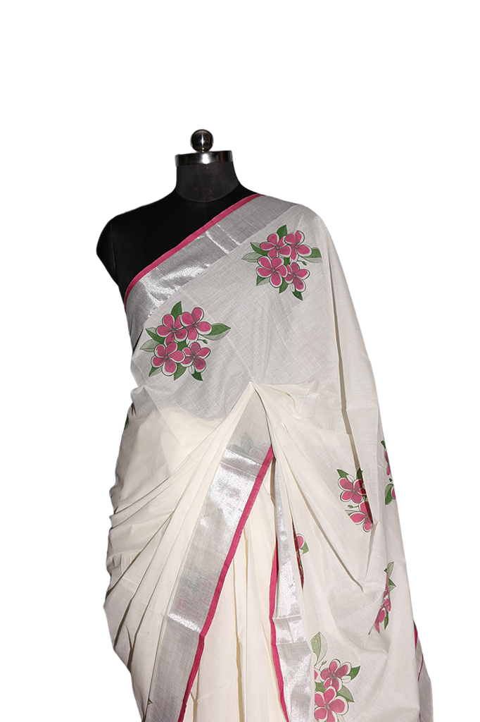 Experience luxury and sophistication with our Pink and Green Floral Printed Kerala Cotton Saree Made from the finest Kerala cotton , This saree features intricate Floral Printed Kerala Cotton Saree Elevate your wardrobe with this exquisite piece that effortlessly combines art and fashion.