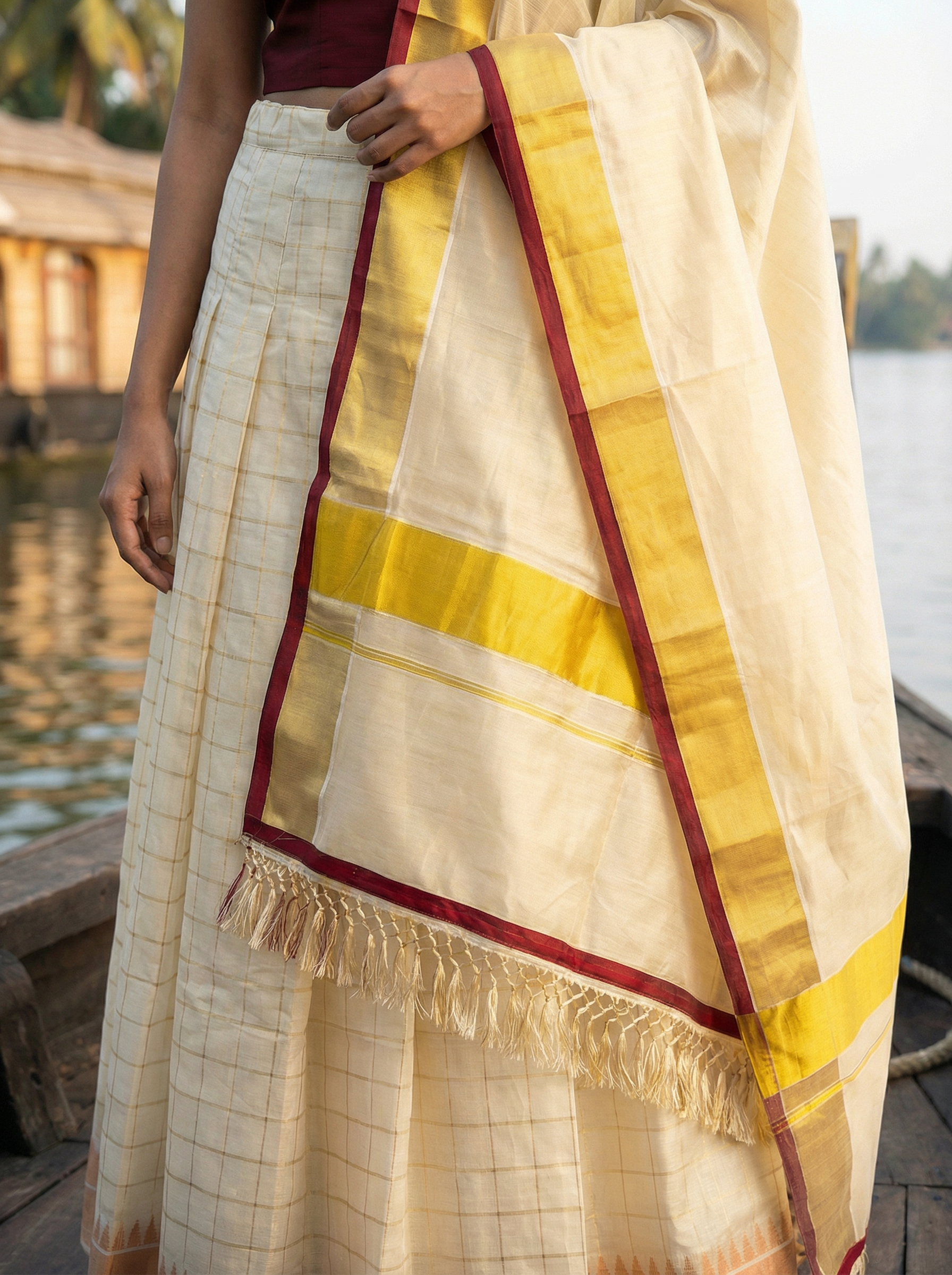 Brighten up your festive wardrobe with our "Checked Kerala Traditional Tissue Kasavu Half Saree / Dhavani Set" Crafted from luxurious golden tissue material, this set elegantly combines traditional elements with a burst of vibrant Embroidery.